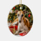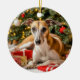 This adorable Christmas ornament, featuring a tan and white Greyhound lying under a Christmas tree, is a wonderful gift for any Greyhound lover.
