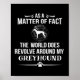 As a matter of fact the world does revolve around my greyhound dog breed humor with the image of a globe and the silhouette of a greyhound. Embellished with squiggles and two dog paw prints.
