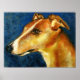 This miniature painting features the greyhound with emphasis on her elegant lines and rich golden colors against a classic blue background. Changing to a standard print size will make your framing options easier!