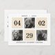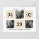 Bold Minimal Modern Cream Colour SAVE THE DATE postcard featuring a black Modern script on the front , 3 engagement photos and 3 squares with day, month and year a template postcard on the back.