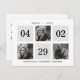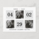 Bold Minimal Modern Silver Grey SAVE THE DATE postcard featuring a black Modern script on the front , 3 engagement photos and 3 squares with day, month and year a template postcard on the back.