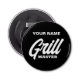 Custom Grill Master beer bottle opener gift for BBQ chef. Cool black and white script typography design. Fun summer Birthday party gift idea for cook, dad, husband, uncle, brother, grandpa, retired person, boss, coworker, colleague, grill king etc. Personalise with a name or monogram. Manly gifts for guys who love grilling. Magnetic back. Sticks to fridge and other metal objects.