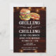 Grilling and Chilling Birthday Invitations. Easy to personalise. All text is adjustable and easy to change for your own party needs. String lights rustic background elements. Fun Chalkboard swirls and flourishes. Watercolor hamburger and hotdog graphics. Invitations for him. Bar or backyard BBQ birthday design. Any age, just change the text.
