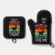 Black oven mitt and pot holder feature a BBQ grill on stripes with the words "Dad be Grilling and Chilling". Perfect gift for father's day or for his birthday.
