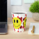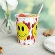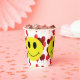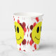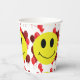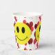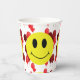 A yellow happy face surrounded by red balloons highlights these cheerful paper party cups.