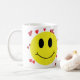 A yellow happy face surrounded by red hearts highlights this cheerful coffee mug.
