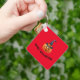 The front of the keychain shows a grinning pumpkin on a red background, together with the words "Happy Halloween!". The keychain can be easily personalised.