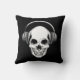 Cool black custom throw pillow with a grinning vector skull with headphones. An awesome cool gift for teenagers, goths and music lovers by The Vector Art Box and The T-Shirt Factory.