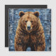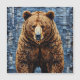 Vibrant artwork depicting a bear with a rich, textured fur coat, set against a patchwork background featuring blue and grey tones. The bear stands imposing and lifelike, capturing attention with its realistic features.