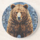 Vibrant artwork depicting a bear with a rich, textured fur coat, set against a patchwork background featuring blue and grey tones. The bear stands imposing and lifelike, capturing attention with its realistic features.