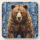 Vibrant artwork depicting a bear with a rich, textured fur coat, set against a patchwork background featuring blue and grey tones. The bear stands imposing and lifelike, capturing attention with its realistic features.