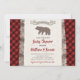 baby shower invitations with buffalo plaid trim, silver birch and a bear silhouette against woodgrain background.
