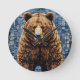 Vibrant artwork depicting a bear with a rich, textured fur coat, set against a patchwork background featuring blue and grey tones. The bear stands imposing and lifelike, capturing attention with its realistic features.
