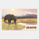 A digital painting of a grizzly bear approaching a pond while the sun descends over distant mountains. Text reading "IDAHO" is also present.