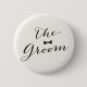 This pin button / nametag design features a modern and trendy black 'the groom' calligraphy script with a stylish bow tie accent on a classic ivory white background.