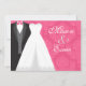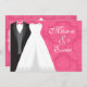 Beautiful and luxurious wedding invitation in pink, black and white. Has fancy floral elements with a bridal gown, black tux with a pink bow tie on the front.