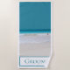 Groom's beach themed beach towel with a photograph of a white sandy beach and turquoise water. Text, across the bottom of the towel reads Groom, and can be personalised to read what you want. Perfect for the beach wedding and honeymoon. Available for the bride also.