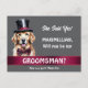 A fun and adorable way to ask your bro to be your groomsman with this graphic of a golden retriever / labrador dog looking very dapper in a black top hat and burgundy bow tie sitting behind a horizontal maroon band set against a medium grey background. White text templates for your custom wording appear to the right of the pet dog which may be personalised to suit your wedding requirements. These are ideal for a groom asking his team to support him on his road to becoming a husband.