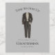 In the centre there is an elegant old fashioned suit. Above the suit there is the arched text "Time to suit up". Below the suit, there is the text: "Your service as a Groomsman is requested". All text is in black caps and can be changed. The background is grey.