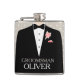 Smartly dressed groomsman in tuxedo and black bow tie graphic wedding hip flask. Reads Groomsman Oliver. Personalise with your own name and title. A great personalised gift idea for male bonding on bucks nights / stag nights, wedding rehearsals or as a wedding favour.