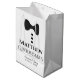 This gift bag is designed for your groomsmen. The design features black text and a black tie with buttons on a white background. Includes a space for his name as well as the name of the couple and the wedding date. Fill with gifts, favors, candy, booze, or any other sort of wedding swag. Great way to thank him for being a part of your wedding party.