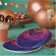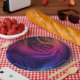 Paper plates with a cool pattern with a sixties vibes. Rainbow coloured circles and swirls.