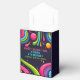 A vibrant and playful birthday invitation featuring a psychedelic, retro-inspired design. The dark background is decorated with colourful, swirling shapes, abstract lines, and vibrant drips of colour reminiscent of the 1970s. The border is a fun pattern of multicolored smiley faces, with stars and bubbles scattered throughout the design. The text is in a mix of bold and playful fonts, with key details highlighted in bright blue and pink.