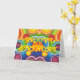 Groovy baby! Greetings card with a swirling, psychedelic rainbow pattern and the words 'Groovy Birthday' written in yellow on the front. A yellow, orange, red, blue, green, pink, purple, and white customisable design for you to personalise with your own text, images and ideas. Taken from an original digitally enhanced coloured pencil drawing by Jess Perry.