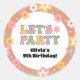 A mod flower power hippie birthday party sticker that's perfect for any young girl's celebration. The groovy design features multi coloured daisies that frame the round sticker. Fun 1970s style letters "Let's Party" add a colourful vibe. Personalise this sticker with the girl's name and age.
