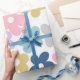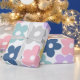 This design features a vintage-inspired 70’s retro daisy happy flowers pattern with bold daisy flowers in bright shades of pink, golden yellow, classic blue, mint, lavender, and white pastels. The flowers are set against a white background, bringing a summery and relaxed boho vibe.