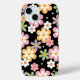 This phone case features a cute retro groovy daisy pattern on a black background.