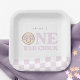Celebrate your groovy girls very first birthday party with our playful lavender chequered 'ONE RAD CHICK' birthday disposable paper plates tableware. This design features an easy-to-love happy face with peace sign glasses and dusty pink wavy chequered patterns.