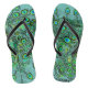 Groovy abstract, exotic flip flops for casual wear. Various shades of neon green with trippy feathers on a teal backdrop and black straps for extra pop. Enchanting and vibrant.