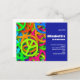 Birthday postcard invitation with a sixties vibe. Cool peace signs in bright and vibrant neon colours featuring all the colours of the rainbow.
