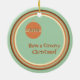 This super cool, groovy retro design in a mid century modern colour scheme of muted orange, mint, cream and brown has a striped ball ornament with the year and the greeting says: Have a Groovy Christmas! in a hip retro style font with a drop shadow. The design is repeated on both sides.