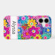 Make a retro statement with this groovy 70s inspired hippie flower power floral iphone 17 phone case! It's modern and trendy with bright multi-coloured watercolor flowers. Make it uniquely yours with your name in a mod font in black. It will look fabulous on your phone!