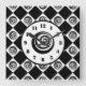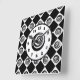 This black and white pattern was inspired by 1960s fashion. Black diamonds alternate with groovy circles surrounding the centre numbered chapter ring.