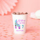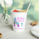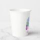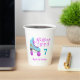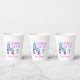 Groovy skating birthday party paper cup featuring illustration of a retro pink and blue roller skate. The text says "rolling into X(age)."