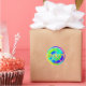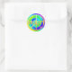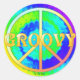 These groovy stickers have a psychedelic rainbow tie-dye background with a pastel peace sign and the word "Groovy" in gold letters.