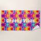 Fun beach towel featuring a colourful retro tie dye background with customisable hippie "groovy vibes" text.