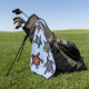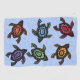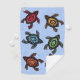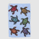 This golf towel is light blue with a group of six abstract black turtles with colourful shells in colours of red, purple, blue, green, orange, and yellow.