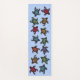 This yoga mat is light blue with a group of abstract black turtles with colourfully marked shells in colours of purple, blue, orange, green, red, and yellow.