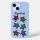 This iPhone case has a group of six black abstract turtles all with colourful shells in various colours of red, orange, purple, green, blue, and yellow on a mottled blue background. Customise your name or text with the template.