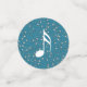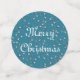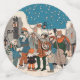 This table confetti has large circles with a group of vintage Christmas carolers singing and playing musical instruments on a street corner with snow covered buildings, a lamp post, and stars in the night sky. Medium circles have customisable Merry Christmas text on stars with blue background and small stars have blue background with white music notes.