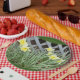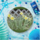A 9 inch Paper Plate, with a Picture of a Group of Daffodils, on it, dark Green Background.