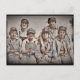 Vintage image of dockworkers/shipyard workers sitting together in overalls and caps. WWII public archive image in graphic art design.