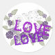 Leaves and flowers in grey, green and violet are woven with the word "Love" in same colours to create a lovely way to spread the message that love can't grow without our help.