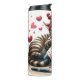 This humourous image features a grumpy, striped cat wearing a red beanie, hugging a large bottle of wine. A glass of wine sits on a wooden table next to it, along with a note and a pen. Floating red hearts and a sarcastic message on the note add to the funny Valentine's theme, contrasting the romantic elements with the cat's grumpy expression.