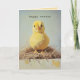 A fluffy yellow chick with an adorably grumpy expression sits in a rustic nest. The artwork in vintage 50s style blends realism and charm, creating a whimsical yet classic aesthetic.