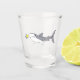 Shot glass with a grumpy tiger shark and a cute yellow fish with blue fins. The design is customizable.